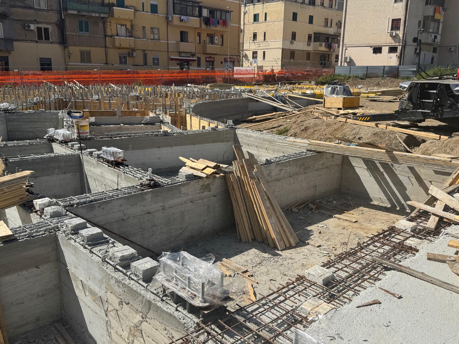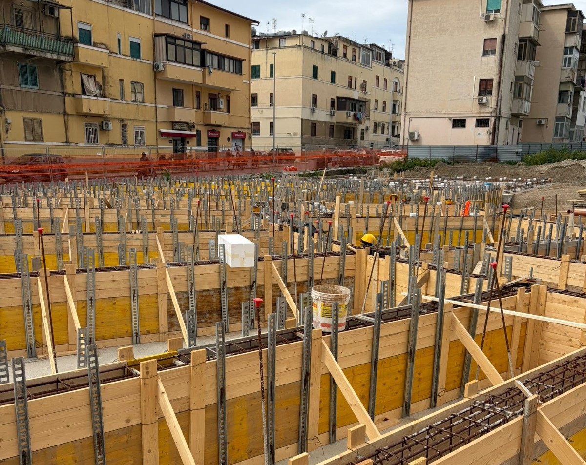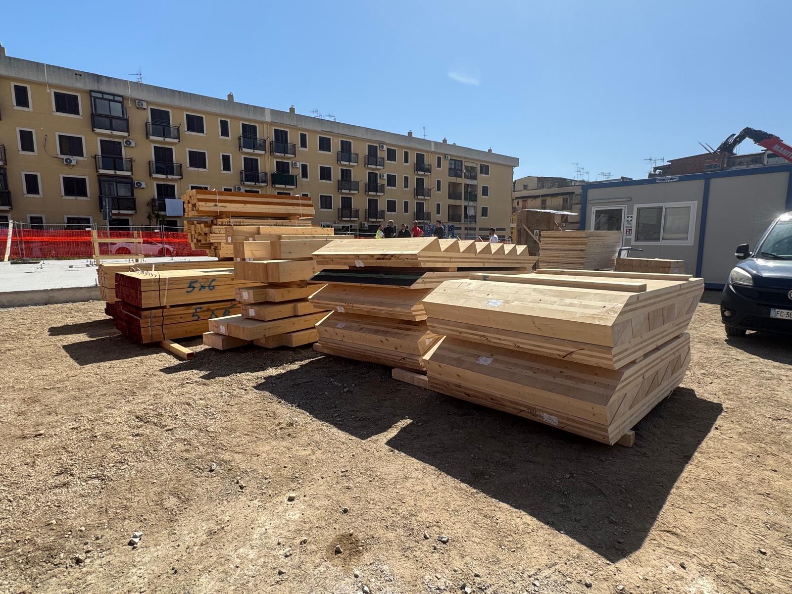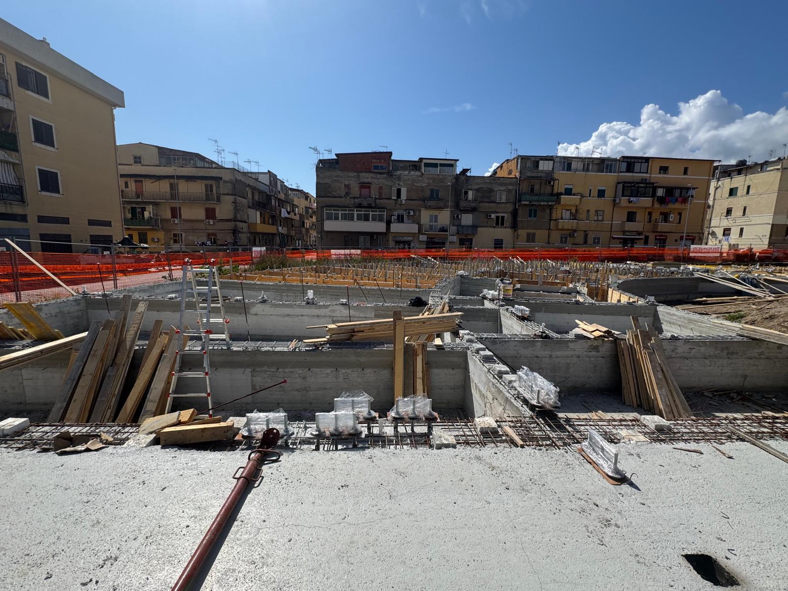 Procedono a buon ritmo i lavori di costruzione di 60 alloggi green a Fondo Basile. Nei giorni scorsi sono arrivati i pannelli X-LAM, le strutture in legno massiccio a strati incrociati che costituiranno l’ossatura degli edifici. Entro il 20 marzo inizierà la fase di posa e montaggio dei pannelli che porterà in poche settimane alla definizione della sagoma del complesso edilizio. Sono state ultimate le fondazioni in cemento armato di uno dei tre corpi dei quali è composto l’edificio e si stanno completando quelle negli altri due. Con l’assemblaggio dei pannelli inizierà la fase più visibile del cantiere, quella in cui le strutture inizieranno a elevarsi e a definire progressivamente i volumi architettonici. L’uso della tecnologia X-LAM, sempre più diffusa nell’edilizia contemporanea, consente un’elevata precisione costruttiva, il miglioramento delle prestazioni energetiche dell’edificio, elevati standard di sicurezza antisismica e la riduzione dell’impatto ambientale del processo costruttivo. Il 10 e l’11 marzo si sono tenuti i sopralluoghi del rup di Invitalia, architetto Massimo Baragli e dell’ingegnere Carmelo Ridolfo della Struttura Commissariale con i rappresentanti delle imprese impegnate nei lavori. Il progetto prevede la realizzazione di un edificio articolato in tre corpi strutturalmente indipendenti, ognuno dei quali di 4 piani fuori terra per un totale di 60 unità abitative con diverse superfici (circa 45 m², 75 m² e 95 m²) destinati alle famiglie provenienti dagli ambiti di risanamento. Gli alloggi sono dotati di logge, spazi esterni privati e posto auto coperto e si affacciano su un sistema di spazi comuni e aree verdi interne, configurate come una corte a servizio dei residenti.